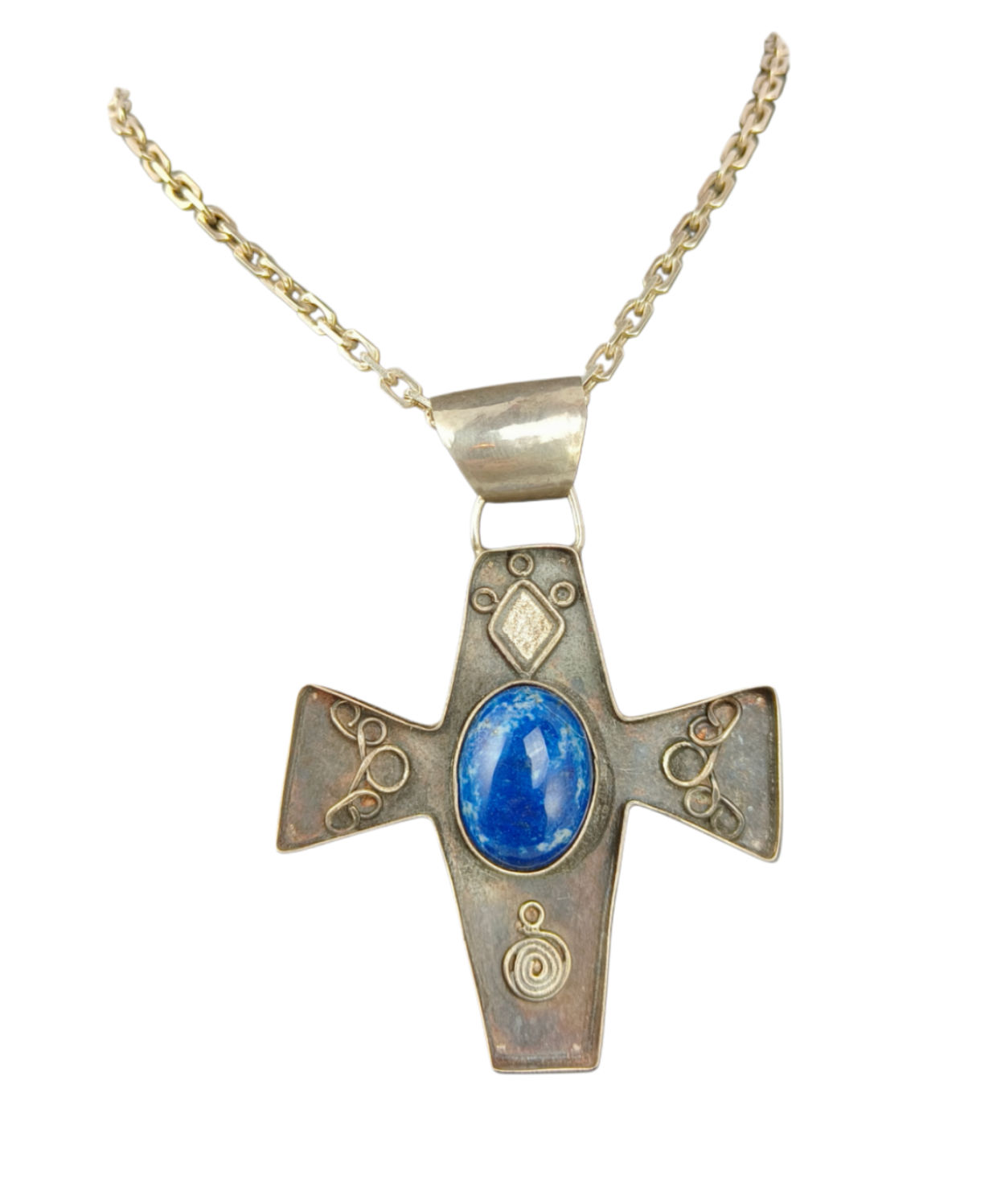 Handgjord hängsmycke i silver 925 och en lapislázuli från Chile. Skapad och tillverkad av Marcos Bearcub denna kraftfulla smycken var tänkt att användas av en person som använder Tredje ögat och jobbar medial, den är tänkt att förstärka den andliga spirituella kontakt och ge klarhet i den inre seende.